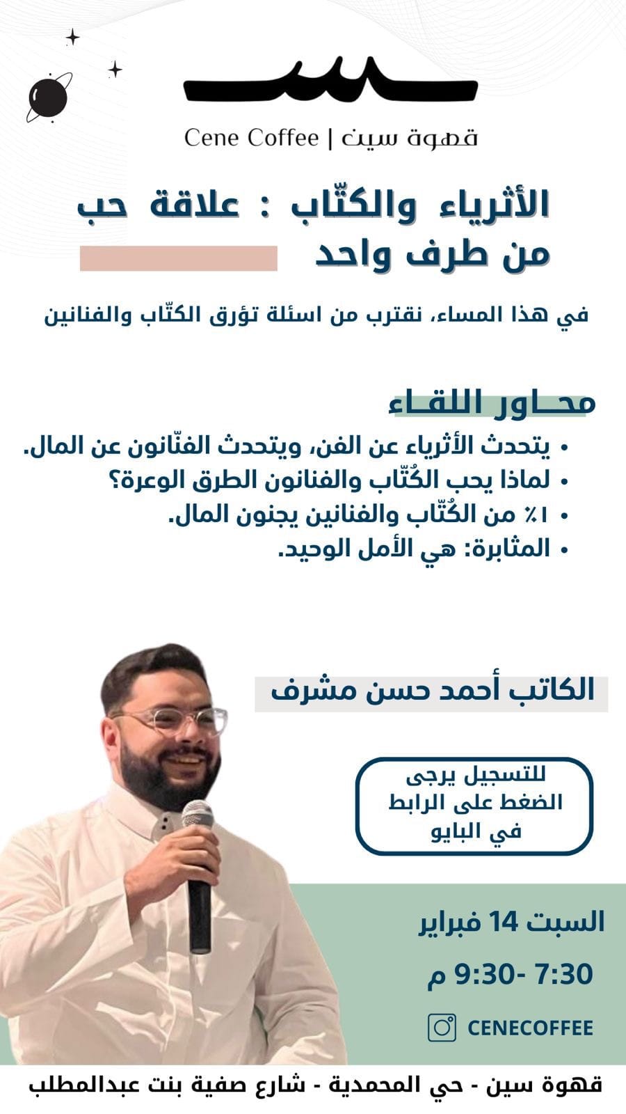 لسكان مدينة جدة، سأتشرف اليوم بأن أكون جزءً من أمسية ثقافية؛ أتمنى أن يسعفكم الوقت لتشريفي وحضورها. ستكون في قهوة سين.